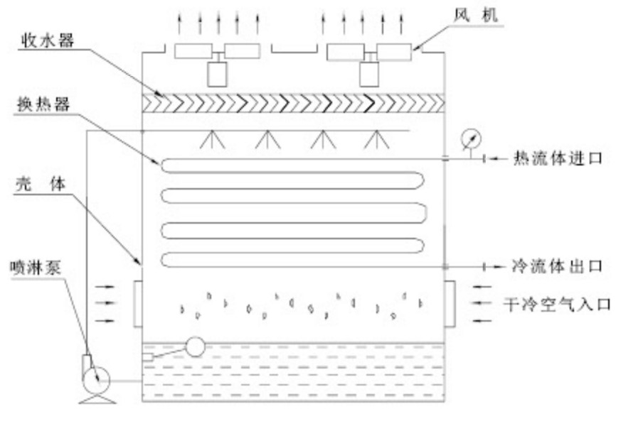 工作時,載熱介質(冷卻水、油或其他液體)由系統循環泵驅動,在換熱器盤管內及需冷卻設備(如∶電源、爐體等)之間循環流動,載熱介質熱量向盤管管壁傳導。噴淋水均勻地噴灑在換熱器上,在換熱器盤管外表面形成均勻的水膜。在風機的作用下,冷空氣由塔體下方的進風口進入塔內,與噴淋水逆流經過換熱器表面,充分接觸,并進行潛熱和顯熱交換,部分水蒸發,使噴淋水溫降低,吸收熱量后的飽和濕熱空氣由風機排至大氣中,低溫噴淋水吸收盤管熱量后流入塔體下部水槽,再由噴淋泵再輸送至噴淋系統。如此往復,換熱器內的載熱介質得到降溫冷卻。在熱交換過程中,盤管內的載熱介質因為沒有與空氣直接接觸,使得品質特性得以保持,不會污染、濃縮、吸濕及揮發。